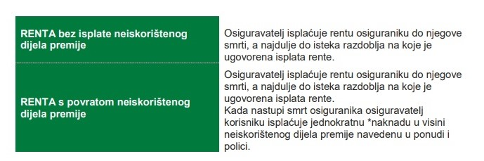 Rentu čini Osnovna renta (garantirana kroz čitavo vrijeme trajanja osiguranja) i Bonus renta (nije garantirana, osiguratelj je može isplatiti na temelju rezultata poslovanja).