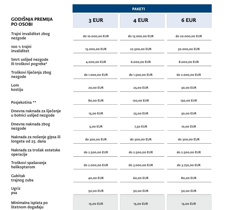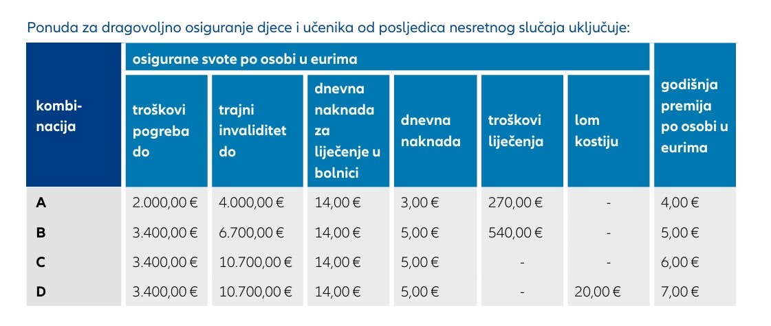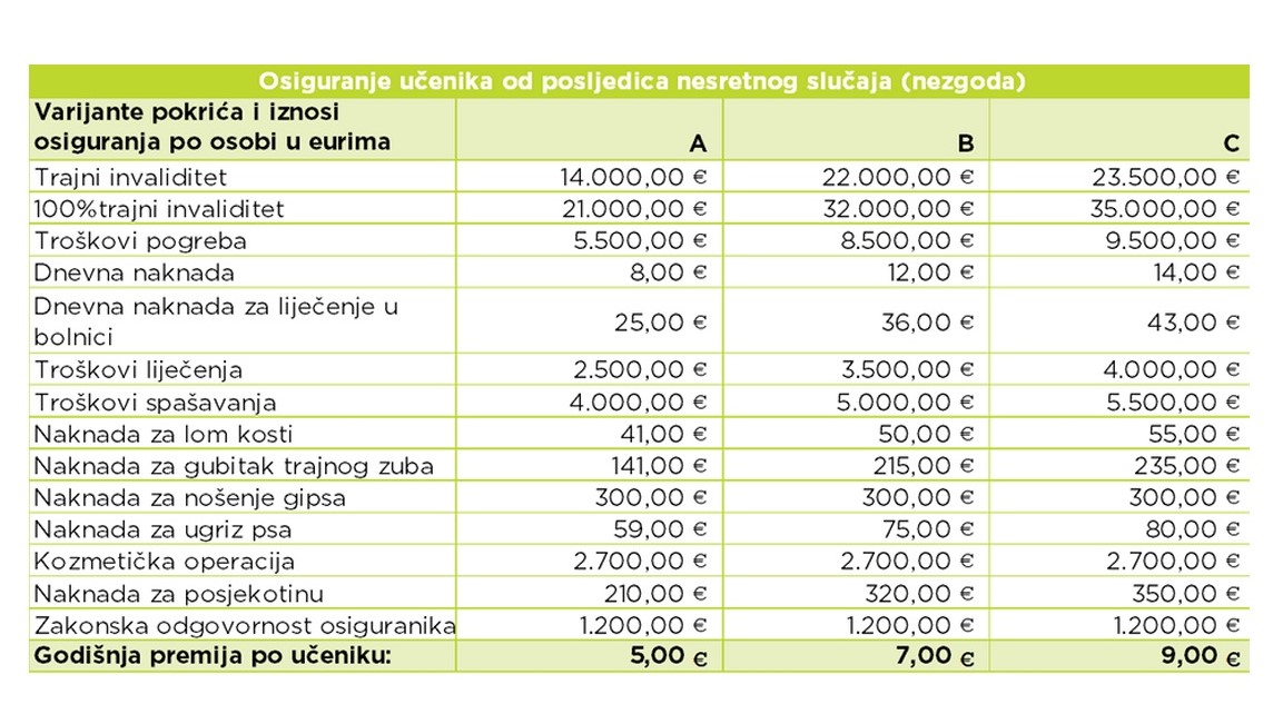 Za novu školsku godinu, 2025/2026 imamo u ponudi veliki izbor osiguranja od nezgode za učenike, studente, djecu u vrtiću. Različite osiguravajuće kuće imaju i različite pakete pokrivenih događaja, osnova svega je uvijek trajni invaliditet, a od dodatnih možete birati: troškove liječenja u bolnici, lom kostiju, posjekotine, dnevna naknada zbog nezgode, naknada za nošenje gipsa, naknada za estetske operacije, ugriz psa, gubitak trajnog zuba itd.